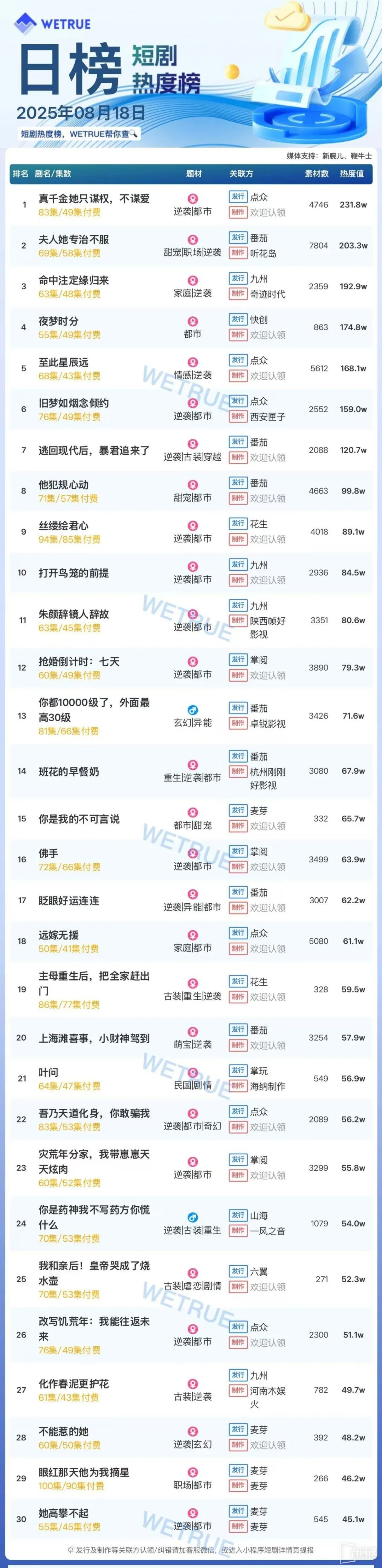 綜上所述就是關於8月18日短劇熱度排行:點眾《真千金她隻謀權,不謀愛》登頂第一的所有內容,在我們的台詞課上,您可以獲得所有的最新、最全的影視內容,無論您是電影迷、電視劇愛好者,或者對娛樂圈文化十分熱愛,我們都會在第一時間為您提供最具有吸引力的資訊和報導,所以趕快關注我們吧。