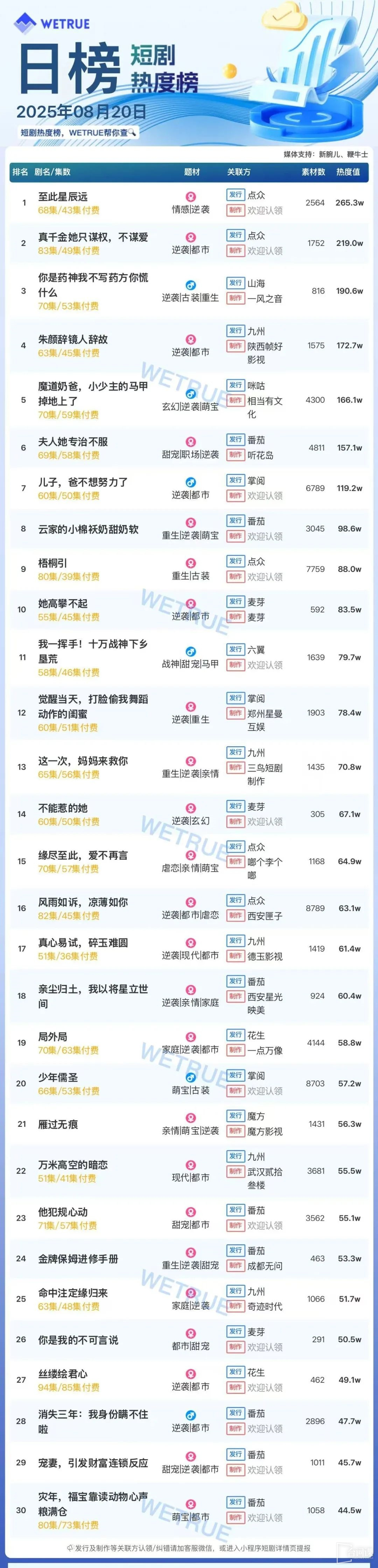 以上就是小編為大家整理蒐集的一些關於8月20日短劇熱度排行:點眾《至此星辰遠》登頂第一內容,希望大家喜歡,如果覺得文章還不錯的話,非常歡迎繼續關注台詞課,之後會為廣大觀眾們揭示更多隱藏在劇情背後的信息和細節。