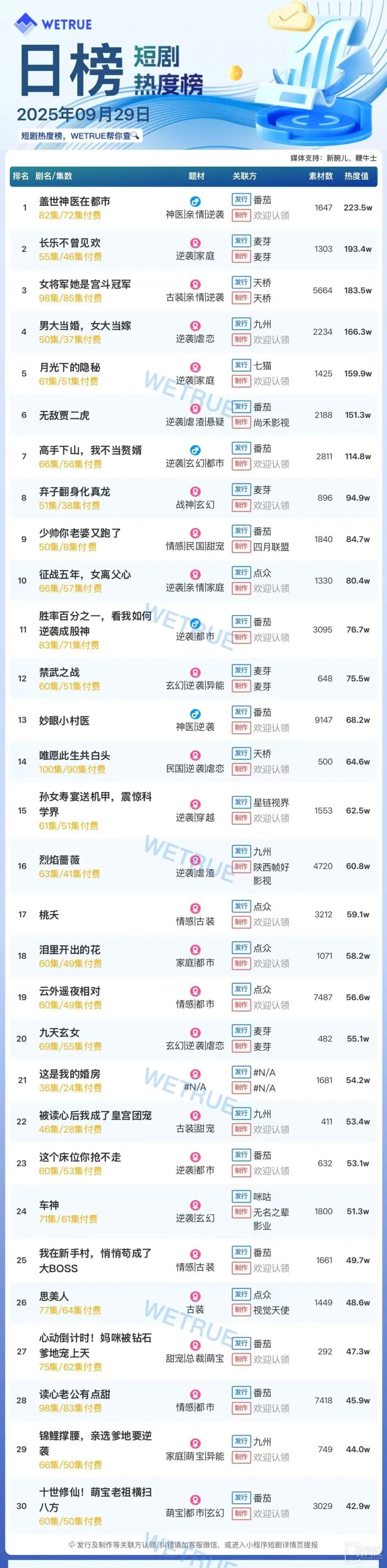 以上是9月29日短劇熱度排行:番茄《蓋世神醫在都市》登頂第一的全部解析內容,想要了解更多相關影視資訊文章,就請持續關注台詞課的每日更新情況哦。